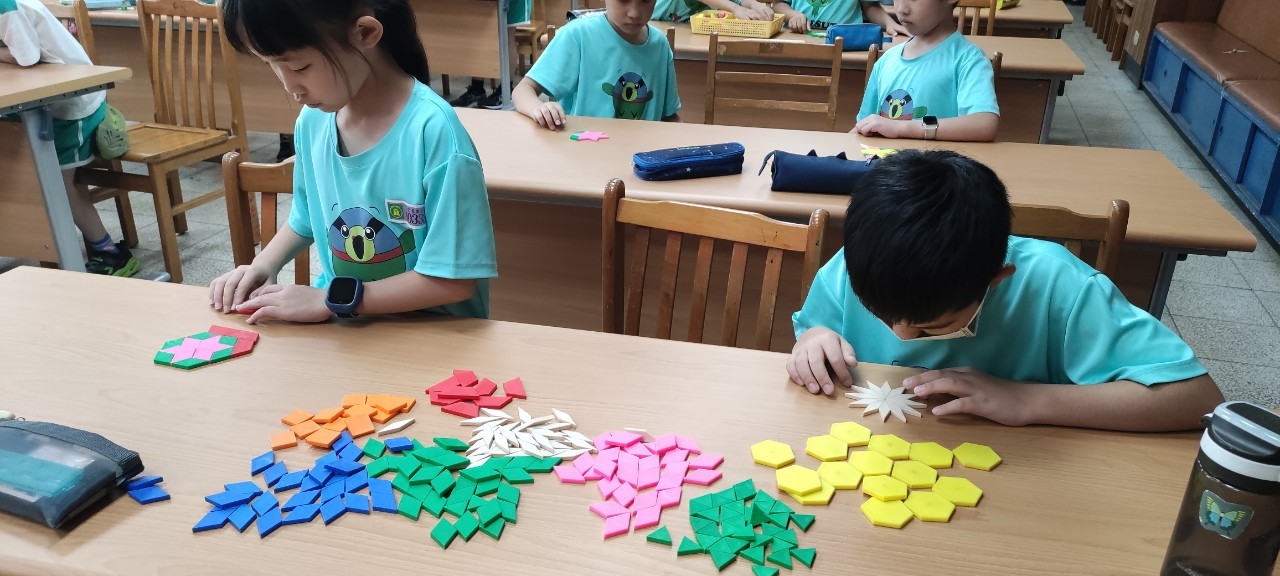 老師透過六種形狀七種顏色的積木,用深入淺出的引導,讓中年級孩子們能多元的認識形狀及形狀變化,顏色、分類與觀察,並且引導孩子進行面積大小探討、相同面積不同大小組合。多種不同的形狀變化,孩子們都樂在其中,徜徉在數學的奧秘中,激發孩子對於數學的想像力!!